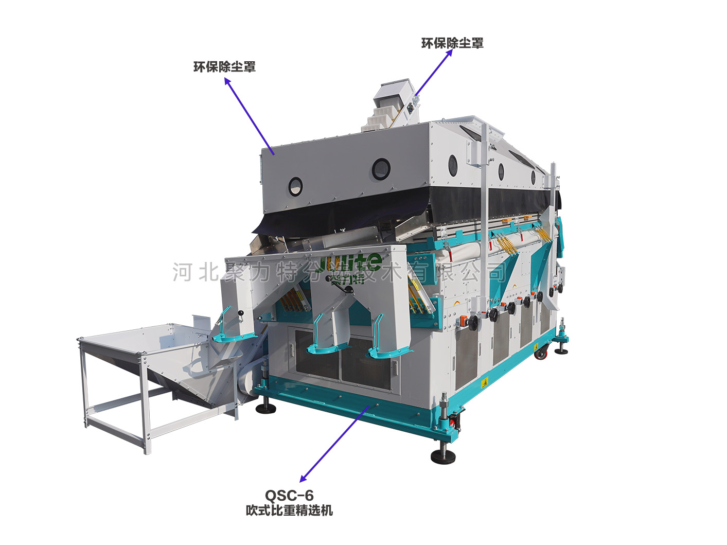 吹式比重精選機是根據(jù)物料在空氣動力和振動摩擦力的雙重作用下產(chǎn)生比重偏析的原理,通過調(diào)整風(fēng)壓、振幅等技術(shù)參數(shù),使比重較大的物料沉到底部貼著篩面由低向高運動;比重較小的物料懸浮在表面由高向低運動,從而達到比重分離的目的。有效去除物料中的秕籽、芽籽、蟲蛀粒、霉變粒、黑粉病粒等比重較輕的雜質(zhì);同時比重精選機振動臺面上部設(shè)有一個去石傾角,能將物料中的石子分離出來。