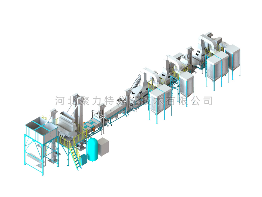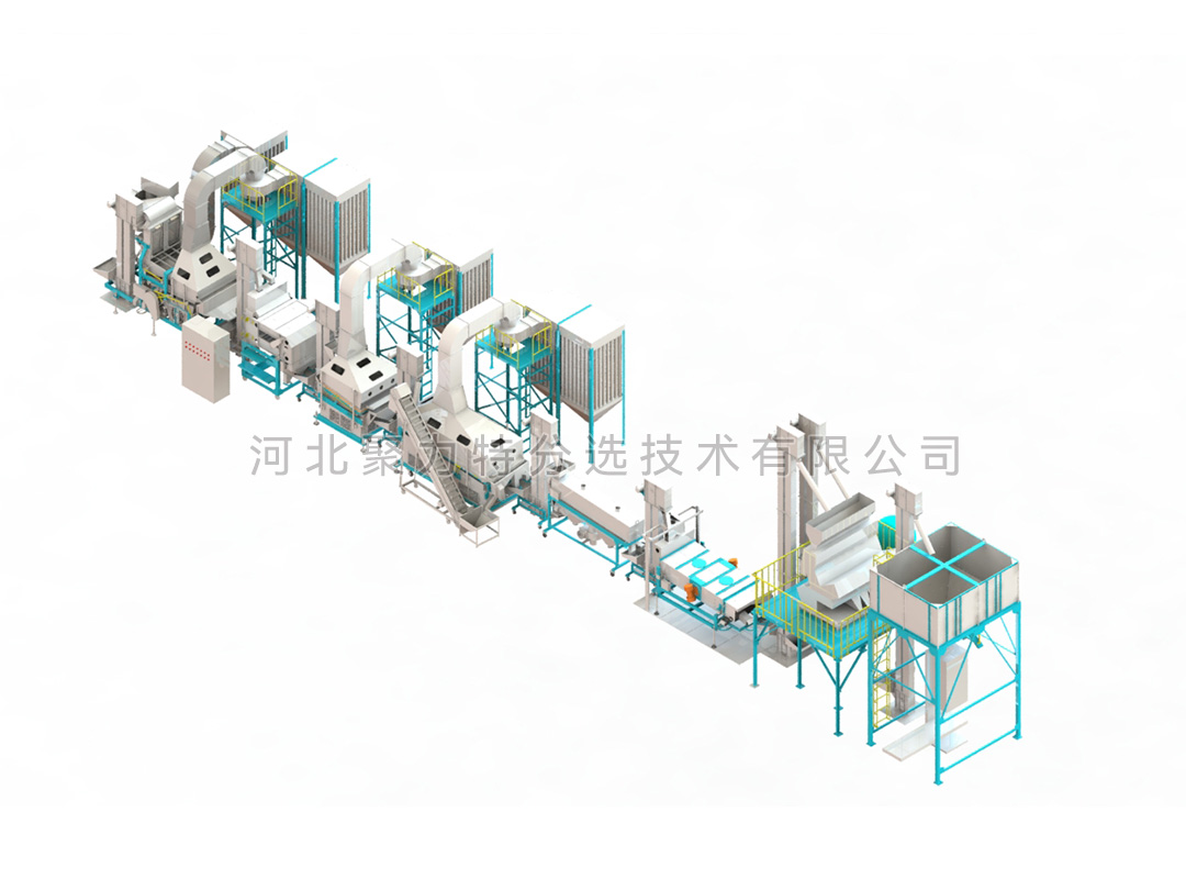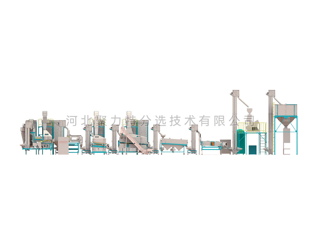 豆類清理生產(chǎn)線由風(fēng)篩清選機(jī)、磁力選土機(jī)、比重去石機(jī)、比重精選機(jī)、拋光機(jī)、振動分級篩、定量包裝秤、脈沖除塵器、布袋除塵器、提升機(jī)和其他輔件組成。